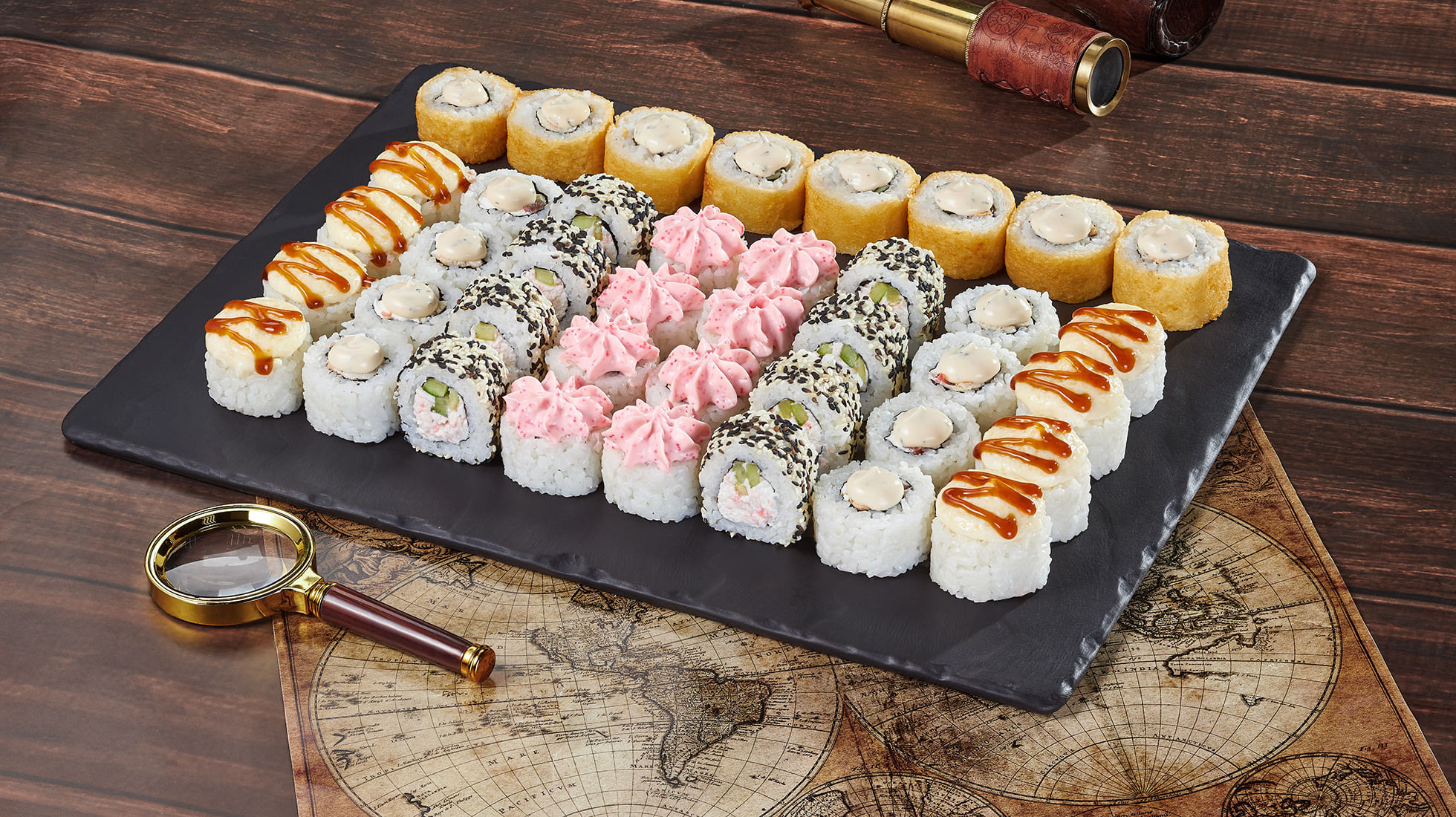 Состав: Ролл Калифорнийская классика (8 шт), Ролл Кракатау фреш (8 шт), Ролл Кентукки (8 шт), Ролл Кентукки хот (8 шт), Ролл Охотский краб (8 шт) *Не забудьте заказать имбирь, васаби и соевый соус. Они не входят в стоимость заказа. *Внешний вид блюда может отличаться от фото на сайте.